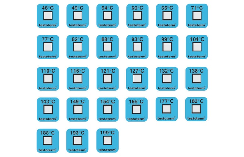 testoterm自粘性单温度贴可以固定在被测物体上用于温度监测,温度升高超过特定温度值即可在2~3s内改变颜色。